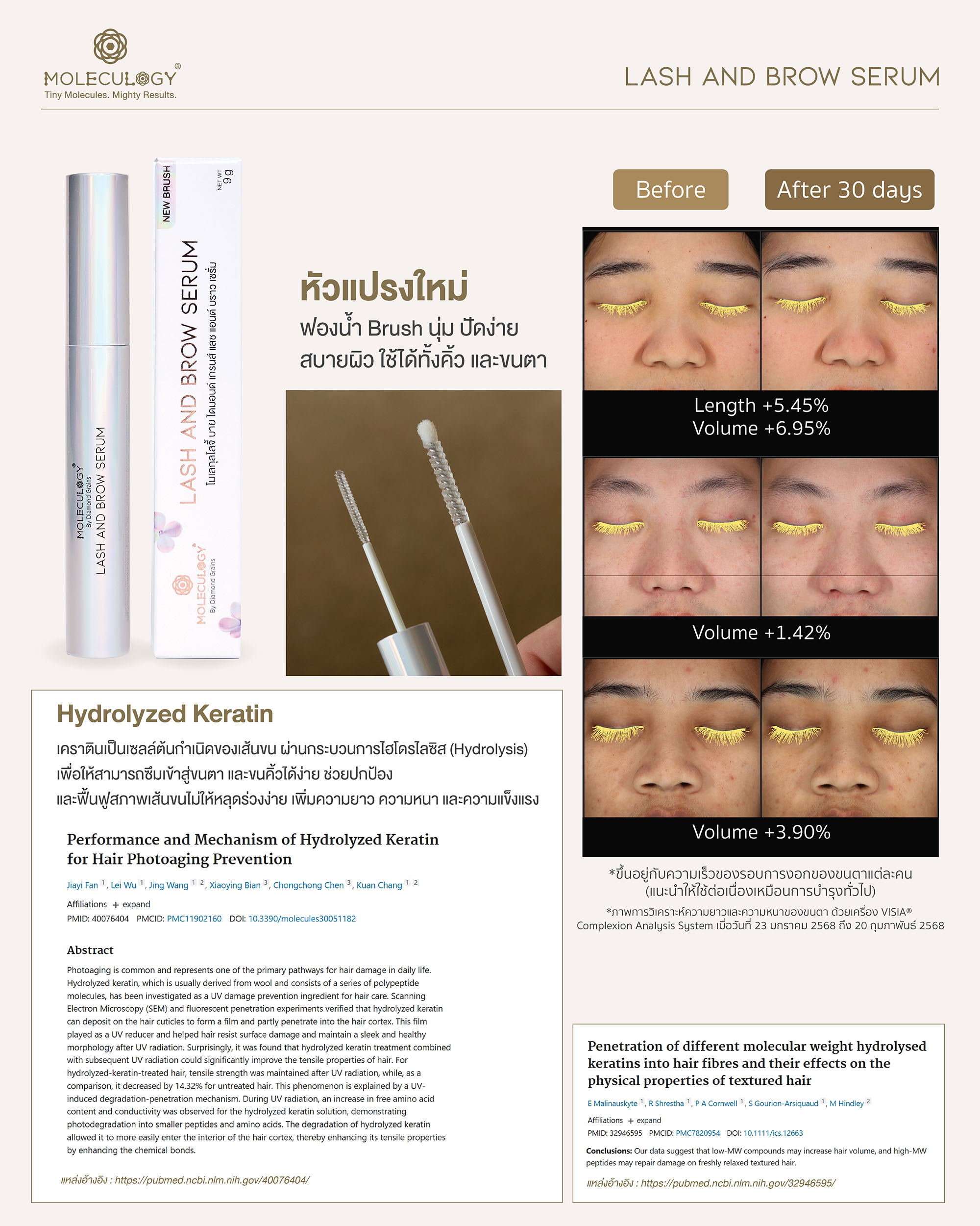 -Hydrolyzed Keratin เคราตินเป็นเซลล์ต้นกำเนิดของเส้นขน ผ่านกระบวนการไฮโดรไลซิส (Hydrolysis) เพื่อให้สามารถซึมเข้าสู่ขนตา และขนคิ้วได้ง่าย ช่วยปกป้อง และฟื้นฟูสภาพเส้นขนไม่ให้หลุดร่วงง่าย เพิ่มความยาว ความหนา และความแข็งแรง